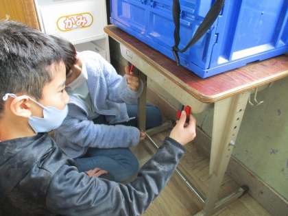 理科「じしゃくのふしぎ」の学習で、磁石を身の回りにあるいろいろなものに近づけて、じしゃくのふしぎを探しました。教室のさまざまな場所に磁石を近づけ、引きつけられるものや引きつけられないものを調べて、気付いたじしゃくのふしぎについて交流しました。「こんなところもひっつく!」「紙が間にあってもひっついた!」と楽しそうに活動していました。
