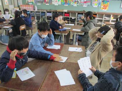 冬休み明けの国語科の学習「冬の楽しみ」では、年末やお正月、節分などの行事の様子を思い浮かべながら、冬の行事にまつわるかるたを作りました。今日は作ったかるたを使って、グループごとにかるた取りをしました。どのグループも楽しそうで、盛り上がっていました。