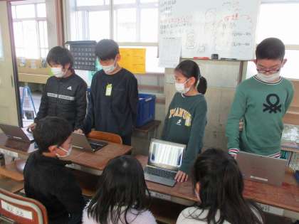 総合的な学習の時間では「防災」について調べてきました。今日はこれまで調べてわかったことや考えたことを3年生に伝える会を開きました。それぞれのグループが工夫して、災害の恐ろしさや避難場所、防災グッズについて伝えていました。