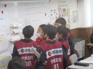 ワクワクワークランド、京都新聞社では実際に新聞を作る体験をしました。午前中は、ワクワクワークランドでみんなが活動している様子を取材しに行きました。午後には、取材した情報を自分たちで原稿に書き、見出しなどは、みんなで話し合い決めました。1日中、一度も気を抜かず新聞を完成させるために、一生懸命頑張っていました。