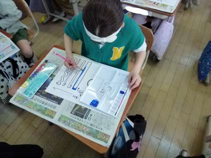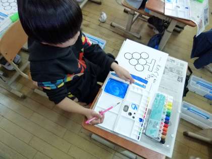 今日は2年生で初めて絵の具を使う学習をしました。はじめは、水の量などを調整して、色の濃さを試してみました。「思ったより薄くなった」と話す声が聞こえてきたり、いろいろな濃さを試して色を塗りました。また、色を混ぜて違う色を作ってみたりしながら、絵の具を試していました。