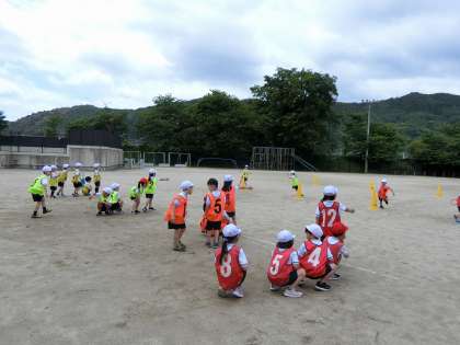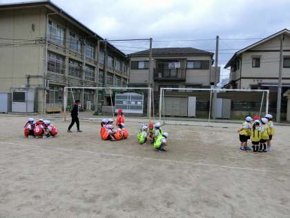 体育では、運動場に出て「かけっこあそび・リレー」を始めました。チームに分かれて、ビブスを着用し、リングバトンを持って走ります。1回走るごとにチームで作戦会議をし、「走る順番を変えてみよう!」「背が高い人から走る?」「いや!早い人からちゃう?」など、自分たちで考えています。勝つことも負けることもある!負けたときは「ドンマイ!次がんばろう!」をみんなの合言葉に楽しくがんばっています。