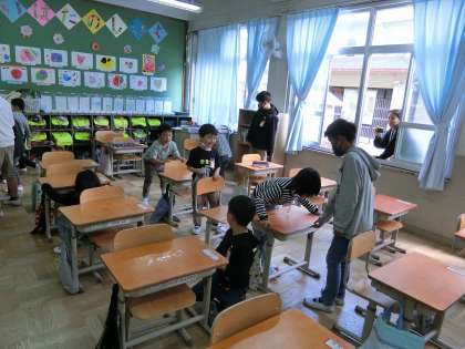 今週からグループに分かれて担当場所の掃除を始めました。給食に続き、6年生がお手伝いに来てくれています。6年生がとても褒めながら丁寧に教えてくれるので、みんなとても張り切ってがんばっています。ピカピカ目指して、がんばります。