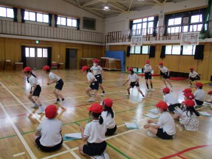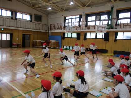 体力テストで、反復横跳びと立ち幅跳びを行いました。友達同士で記録を数えながら、応援しあう姿も見られました。昨年よりスムーズに動けるようになり、「記録がのびた!」と嬉しそうな姿も多く見られました。