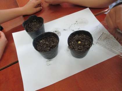 理科「植物の育ち方」の学習で、ヒマワリとダイズ、ホウセンカのタネを植木のポットにまきました。植物の種類によって種の数や植える深さや異なるため、植物にあわせてタネをまいていました。どんな葉が出てくるのか楽しみです。