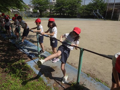 鉄棒運動がんばっています。「できるようになりたい。」と、GIGA端末で見本をよく見て、コツを考えて取り組んでいます。