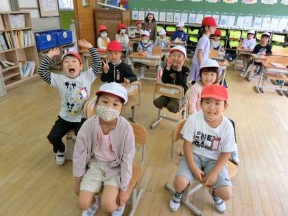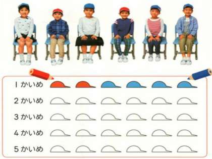 10人で6個のイスを使ってイス取りゲームをした結果をもとに、「6」はいくつといくつに分けられるか調べました。片方のクラスは赤白がいつも2と4の結果で「こればっかり!」となったり、片方は白ばかりの結果に「これは6と0?」となったり、盛り上がりました。次時も、「イス取りゲームやりたい!」という子どもたちでした。