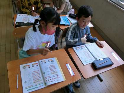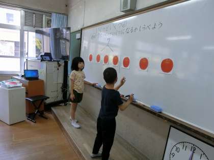 7個のリンゴがいくつといくつに分けられるか、ペアで発表しました。発表がどんどん上手になってきており、役割分担し協力して発表しています。最後は、「7になあれ!」と二人でサイコロを振って、出た目を足して7になるようにゲームをしました。試合結果を真剣にノートに書いていました。