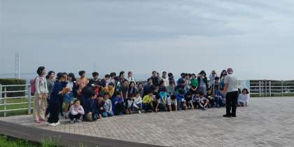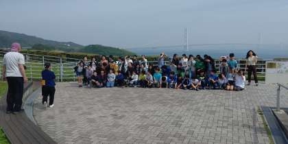 淡路島から明石海峡大橋を背景に学年写真を撮りました。
