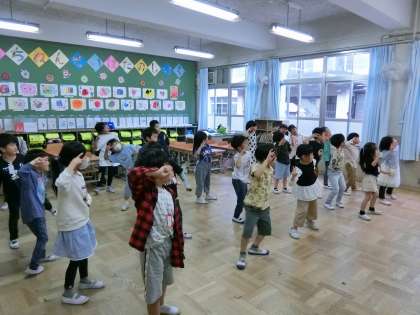 今日は、6月に予定されている1年生を迎える会の出し物の練習をしました。内容は、体育でがんばったおなじみのダンスです。久しぶりに踊りましたが、みんな覚えていて楽しんで踊っていました。これから本番に向けて練習をがんばります。