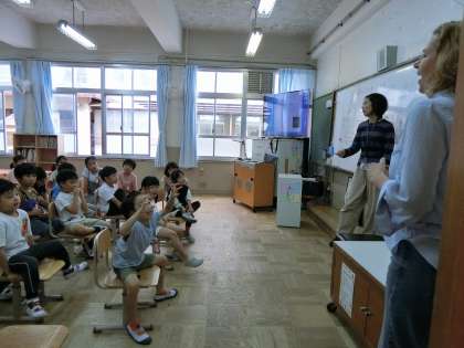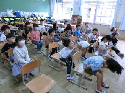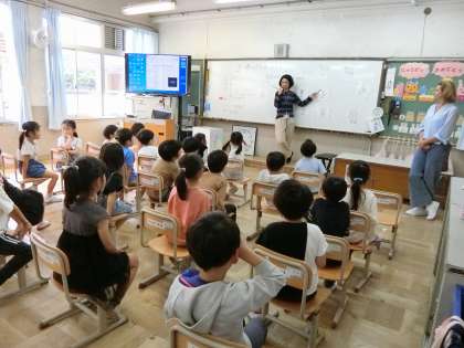 ミーガン先生との授業をとても楽しみにしている子どもたち。今日も英語の歌に合わせてあいさつをしたり、体の部分を言ってみたり、楽しい学習でした。ミーガン先生が帰る姿を見つけると「ミーガン先生バイバーイ!」と大きな声で見送っていました。英語にもどんどん親しんでいこうと思います。