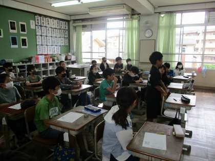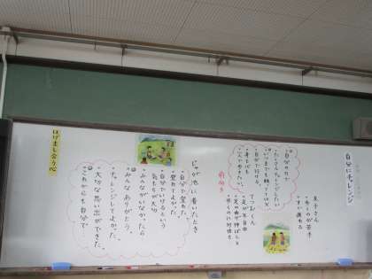 毎月1日は、こころの日です。今月は「自分にチャレンジ」という教材で、「はげまし合う心」について考えました。苦しいときや失敗したときに、友達に声をかけてもらったり応援してもらったりすると、がんばる気持ちになると気付いていました。そして、どんなことにもチャレンジして、励まし合って達成したいという思いをふくらませていました。