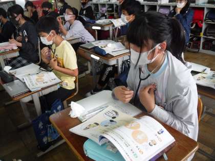 理科のでは体のつくりについて学習しています。聴診器で自分の心臓の音を聞いたり、手首で脈を数えたりしました。「はく動」や「脈はく」という言葉も学習しました。心臓はどのような役割をしているのか、みんなで予想して話し合いもしました。