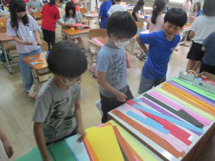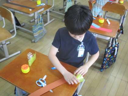 図工で「わっかでへんしん」に取り組んでいます。輪ゴムと色画用紙でできたわっかを使って、変身する飾りを作ります。変身したいもののイメージを膨らませながら、飾りの形や色を工夫していきます。
