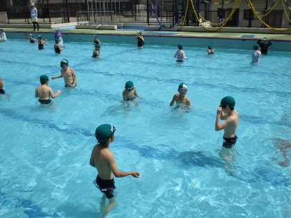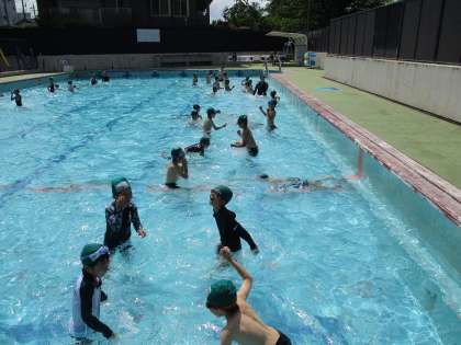 今日の水泳学習では、まず水中じゃんけんや碁石ひろいを行い、次にいろいろな浮き方に挑戦しました。楽しそうな声をあげながら活動していました。次は蹴伸びやビード板を使った泳ぎ方に挑戦していきます。