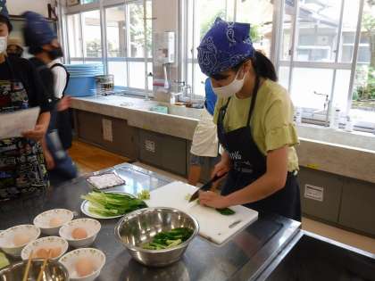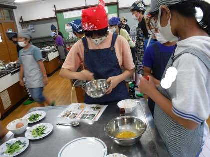家庭科の学習で、スクランブルエッグと小松菜の炒め物を作りました。まずは、卵を割り、塩とこしょうを入れて混ぜました。小松菜は、水で土を落とし、食べやすい大きさに切りました。