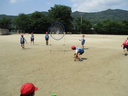 体育科でハンドベールボールの学習を行っています。はじめはボールを打ったり、拾ったりする動作をうまくできない子がたくさんいましたが、だんだん上手になってきました。ルールも覚え、ゲームらしくなってきました。