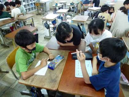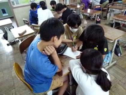 今日は学活「山の家に向けて」の時間にそれぞれの係ごとに分かれて係の準備をしました。係ごとに入所式の言葉を考えたり、キャンプファイヤーの時の活動を話し合ったりと山の家に向けてそれぞれの係が協力して活動していました。