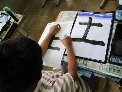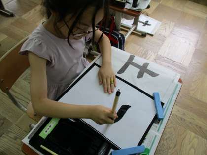 書写の学習で、たて画の筆使いに気を付けて「土」を書きました。前回の学習で学んだ始筆や終筆を思い出し、たて画でも「とん!すうっ。びたっ!」を合言葉に筆を運んでいました。まずは、自分たちで思うように書き、見本と見比べて修正する部分を確認してから本番に挑んでいました。
