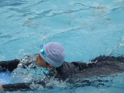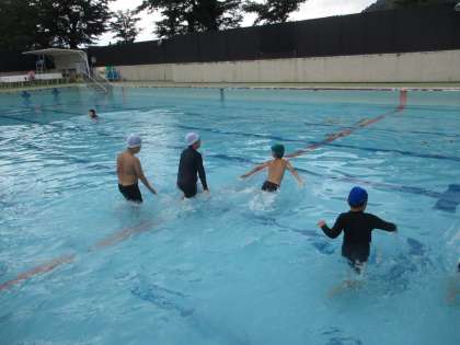 少し肌寒い日もありますが、子どもたちは「水遊び」の学習をとても楽しみにしています。プールの端から端まで歩いたり、走ったり、ワニやカニになりきったりして水と仲良くなれました。