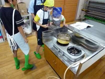 ごはん係の子どもたちは、時間を見ながら火加減も調整していました。少し水が多かった班や水が少なくて焦げてしまった班がありましたが、「山の家ではもっとおいしくごはんを炊きたい!」と、はりきっていました。