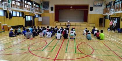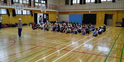 今日から2泊3日の山の家に出発します。今から体育館で出発式を行います。