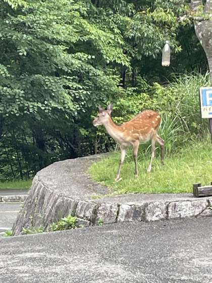 今日のお昼ご飯は野外炊事です。野外炊事に出かけようと玄関を出ると、野生の鹿が、草をほおばっていました。朝ごはんかな。