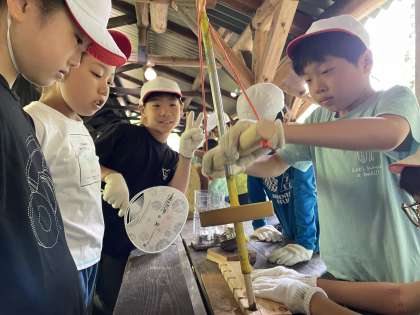 一生懸命、仲間と火を起こしています。力づくでもダメだし…なかなか難しいですね。さあ、頑張ろう。いち、に。いち、に。掛け声も聞こえますよ。