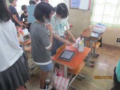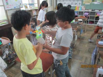 図画工作科の学習で、くるくるクランクの学習をしています。子ども達が、頑張ってつくった作品が完成したので、今回は友達の作品をお互いに動かして、鑑賞しました。「クランクの上下の動きをうまく使っている。」や「ゲームみたいになっていておもしろい。」などと、お互いの作品の良いところをたくさん話していました。