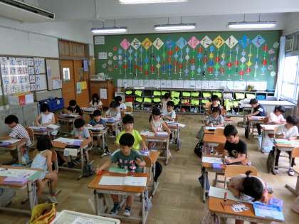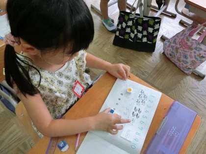 「いくつおおいか」を求める計算は何算か?「おおい」の言葉に「たしざんじゃない?」と子どもたち。ブロックを使って確かめてみると、実は「いくつおおい」は引き算であることに気付き、「意外やな!」と感想を言っていました。問題カードのノートへののり付けも早くなりました。45分頑張る姿が板についてきました。