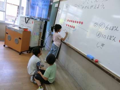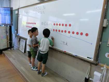 問題が引き算か足し算か図を利用して考え、式と答えも発表しています。前であたった人がそれぞれの担当の部分を書きますが、途中で相談する場面もあり、助け合っています。横からのアドバイスをもとに、自信をもって発表する姿が見られました。