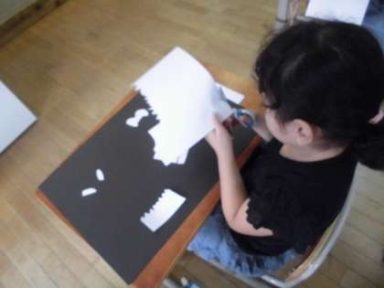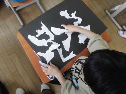 できた形を黒い画用紙の上に置き,何に見えるか想像を広げました。向きや並べ方を工夫して貼り付けていきました。