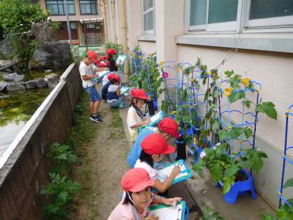 毎日水やりをしているアサガオの花が、たくさん咲き始めてきました。生活科の学習でも、アサガオの観察をしている最中、「きれいな おはなが さいてるよ!」「つるが ながいよ」という声が多く聞こえていました。しっかり水やりを、がんばりましょうね。