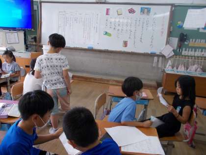 国語科「あったらいいな、こんなもの」の学習です。ドラえもんの道具のように、こんなものあったらいいなと思うものが出せたら?子どもたちは張り切ってどんどん楽しいアイデアを出しています。空を自由に歩くことができる靴、学校まで瞬間移動で連れて行ってくれるロボット、透明で柔らかい乗り物、などおもしろいアイデアがいっぱいです。