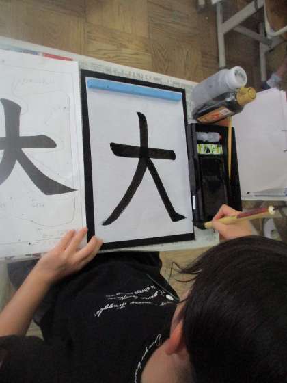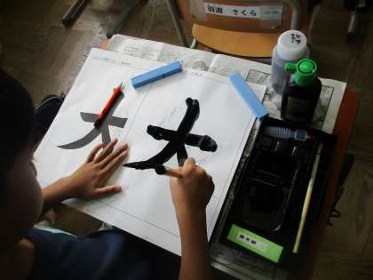 今週の毛筆の学習では、はらいの筆使いに気を付けて、「大」の字を書きました。左はらいはだんだん力を抜きますが、右はらいではだんだん力を入れるため、力加減に苦戦している様子も見られましたが、大きな「大」を書いていました。