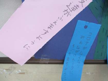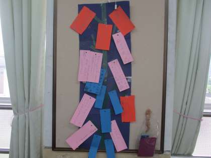 7月7日は七夕でした。自分たちで作った笹に短冊を飾っていました。たくさんの願い事が書かれていました。