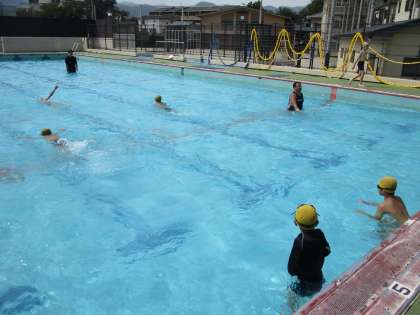 5年生は、水泳学習で自分のめあてに向かって泳ぐ練習をしています。「クロールと平泳ぎで50m泳ぎたい。」「25m泳げるようになりたい。」「息継ぎができるようになりたい。」など、それぞれのめあてに向かって一生懸命練習していました。
