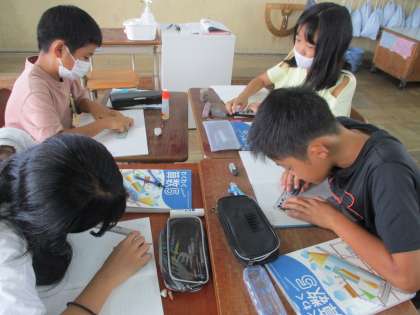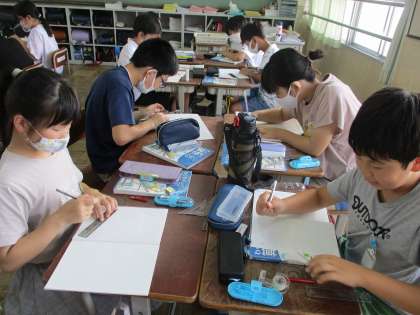 算数科の学習では、「合同な図形」について学習しています。今日は、合同な三角形をかくためにどのように頂点をきめたらよいかを考えました。「それぞれの辺の長さがわかればかけそう。」「角度の大きさも測ってみよう。」など、グループで意見を出し合って、ノートにかいてみました。
