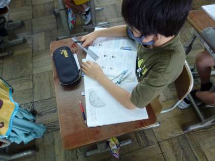 算数「合同な図形」でコンパスや分度器を使いながら、合同な三角形を書く学習をしました。4年で学習したことを使いながら、ぴったり重なるようにきれいに三角形をかけていました。