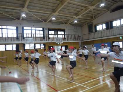 運動会で行う集団行動にむけて、行進の練習をしています。手の振り方や足の足踏みのリズムがきれいに揃うようになってきました。