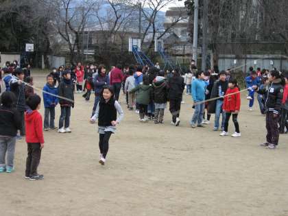 21日(火)の6時間目に集会委員会・運動委員会が中心になって,大なわ大会を実施しました。5分間に「八の字とび」で何回跳べるかをスマイルグループで競いました。