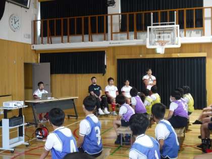 キャリア講義では、ラグビー憲章という言葉を教ていただきました。「品位・情熱・結束・規律・尊重」の5つの言葉や、ノーサイドの精神など、会社で働く中で役立ったこと等、エピソードもお話していただきました。子ども達もグループワークで、学校生活の中で、ラグビー憲章とつながる場面について話し合いました。