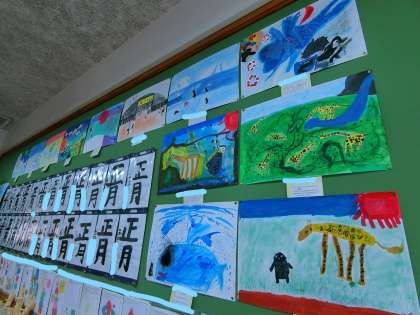 3年生の教室には,図工の作品がたくさん飾られています。今は,お話の絵や,くぎ打ちトントンの作品が飾られています。