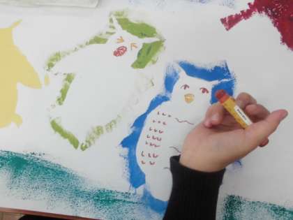 ステンシル版画を行った画用紙にクレパスで絵を描き足して作品を仕上げました。