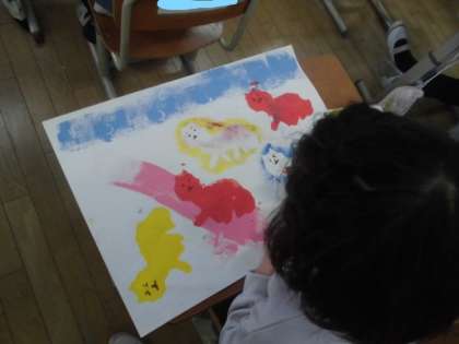 クレパスで,動物の目や口,羽の模様,一緒に遊んでいる自分や友だちなどを描き足して楽しい絵がたくさん完成しました。