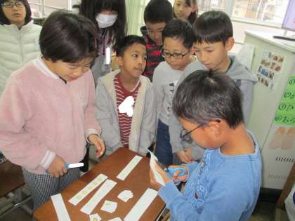 写真は、オリジナルピザに必要な食材を集めている様子です。お店屋さん役と買い物をする人役に分かれて、やり取りをする中で、外国語の表現に親しむことができました。