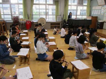 今日は音楽の学習で、リコーダーの練習をしました。リコーダーは、音の出し方次第で明るい感じになったり、暗い感じになったりすることが分かり、様々な音の出し方で表現することを楽しみました。新しく学んだ「ソ」のシャープは、二つの穴の片方だけを押さえる難しい指使いでしたが、一生懸命練習することができました。