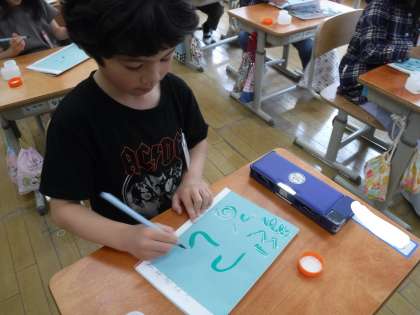 書写で「とめ」と「はらい」の学習をしました。「ぴたっ」「すうっ」と声にだしながら、線の終わりに気を付けて「つ・く・し」の三文字を書きました。みずふで使って、すうっっと優しくはらう書き方も練習することができました。