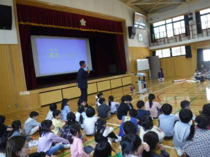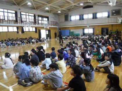 全校集会がありました。全学年の顔が見えるように座って、校長先生のお話を聞きました。憲法のお話で1年生には少し難しかったですが、命を大切にすることをしっかりと覚えていました。