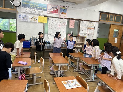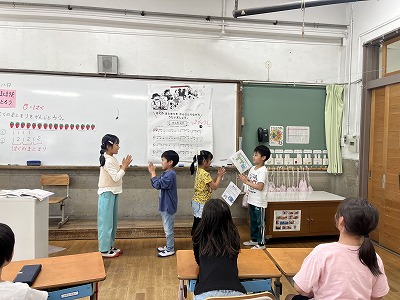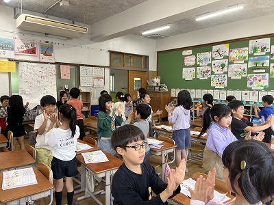 テンポに合わせて、一人ずつ「タンタン」とリズムを打ち、全員で手拍子を繋げることができました。最後の児童が手拍子をした瞬間、みんなが口を揃えて「やったー!」と言い、達成感を抱いている様子でした。